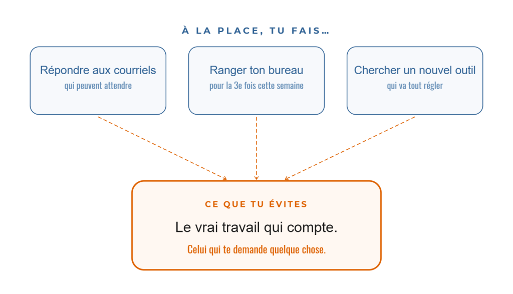 C’est ce qu’on appelle la procrastination productive et c’est l’une des formes les plus sournoises d’évitement, parce qu’elle ressemble à de la productivité de l’extérieur.