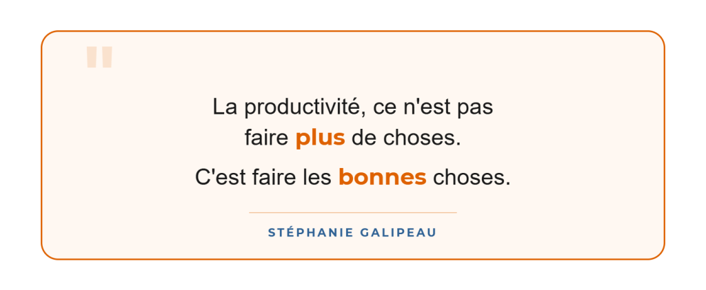La productivité, ce n’est pas faire plus de choses. Ce qu’on veut c’est être efficient. C’est-à-dire faire les bonnes choses, de la bonne manière et avec les bons outils. Même quand c’est inconfortable. Même quand t’as pas envie. Même quand tu te sens pas prête.